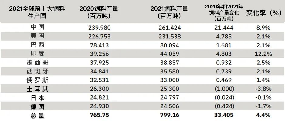 全球前十大生产国饲料产量共计7.99亿吨,同比去年增长4.4%,中国仍然是全球最大的饲料生产国,其产量为2.61亿吨,而且实现了2020年以来最大的增长;