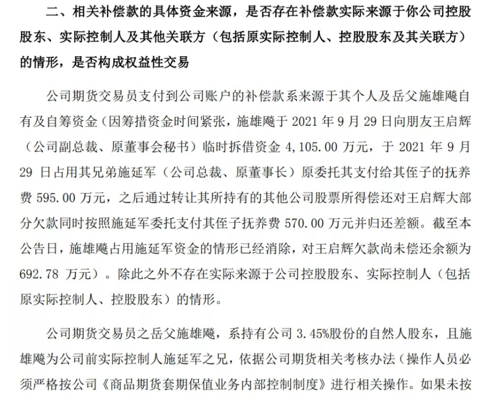 对于交易员的补偿款来源,金字火腿解释称,系来源于其个人及岳父施雄飚自有及自筹资金。而施雄飚,恰是持有公司3.45%股份的自然人股东,且为公司前实际控制人施延军的哥哥。