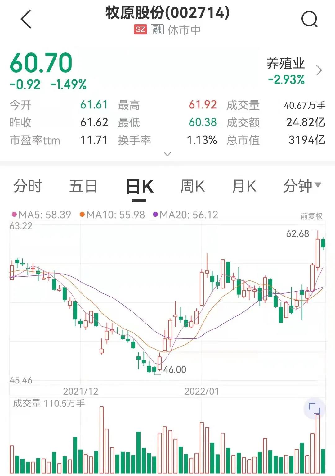 截至2月11日收盘,牧原股份报60.70元/股。若以此价格计算,仅限制性股票激励对象浮盈已超过24亿元,人均浮盈40万元。