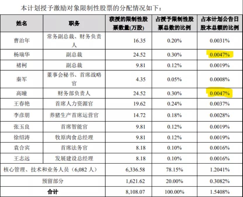 牧原股份披露的股权激励名单显示,公司副总裁、董事会秘书、财务部负责人、首席业务执行官、分公司总经理均有认购,最高者占牧原股份总股本的比例达到0.0047%。