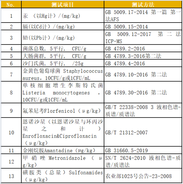 本次消费调查根据《GB 2749-2015 食品安全国家标准蛋与蛋制品》、《GB 31650-2019 食品安全国家标准 食品中兽药最大残留限量》等食品安全国家标准的规定,共对12款产品中的13项指标进行了测试,覆盖污染物项目、微生物项目和兽药残留项目。