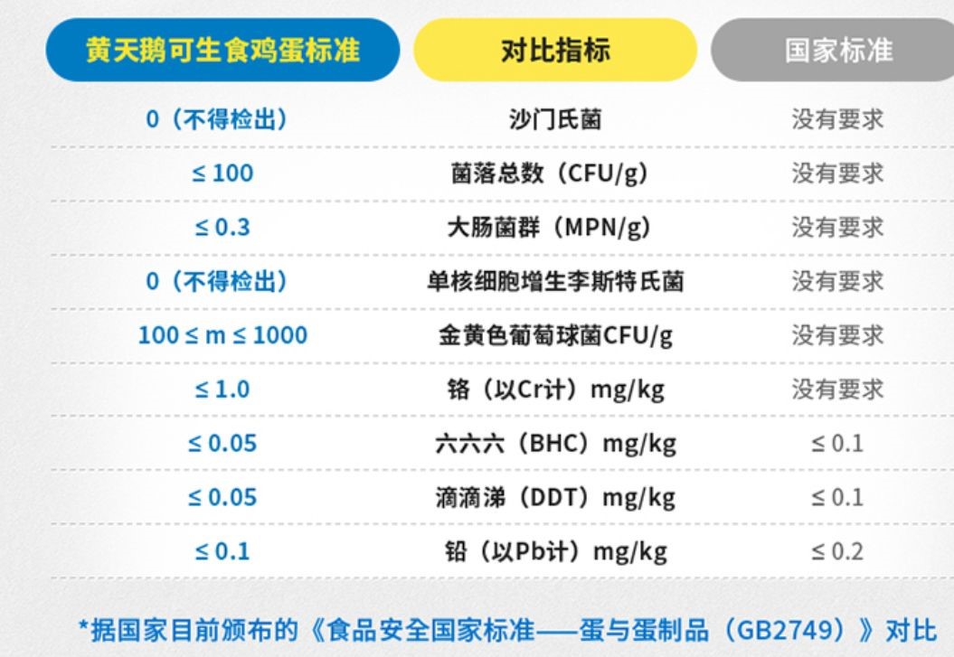 目前,国家标准不检测非即食鸡蛋中大肠杆菌、沙门氏菌的菌落总数。同时,对铬(Cr)没有限量标准,仅对镉、铅和总汞有要求。而可生食鸡蛋把品控的重点放在致病菌方面,这方面,可生食鸡蛋的级别确实高于国家标准。
