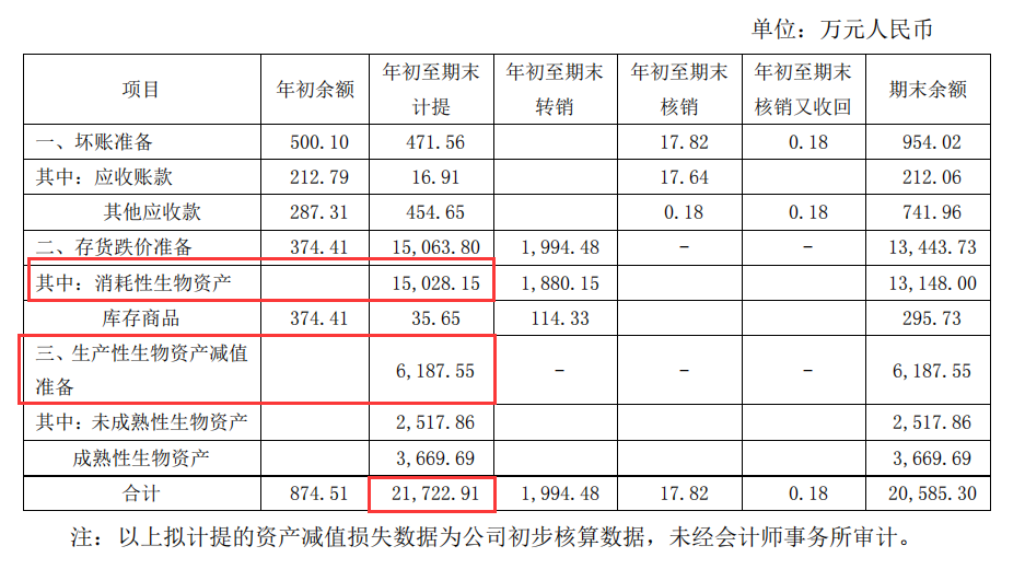 在另一份计提资产减值准备的公告中,华统股份对计提资产减值准备做了详细解释,其中最主要的有两项:一是2021年度主要由于国内生猪市场价格发生大幅下降等原因,公司基于谨慎性原则,对存货计提跌价准备1.50亿元;二是2021年底,考虑到生产性生物资产较多,国内生猪行情预期不明朗,经公司管理层减值测式,对生产性生物资产计提减值6187.55万元。