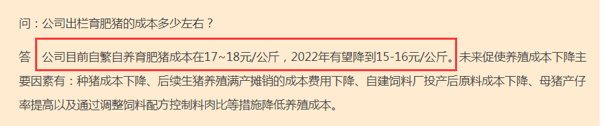12.67元/公斤的价格,实际上已远低于养猪企业的成本价。在1月4日的一份投资者关系记录中,华统股份表示:公司目前自繁自养育肥猪成本在17-18元/公斤,2022年有望降到15-16元/公斤。