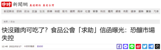 中时新闻网称,台湾农业专家“Lin bay 好油”16日在脸书贴出“台湾区冷冻食品工业同业公会”发给“农委会”的函,称会员反映各地暴发禽流感疫情,导致近期鸡肉供给数量将出现短缺,恐有造成消费市场失控之虞。