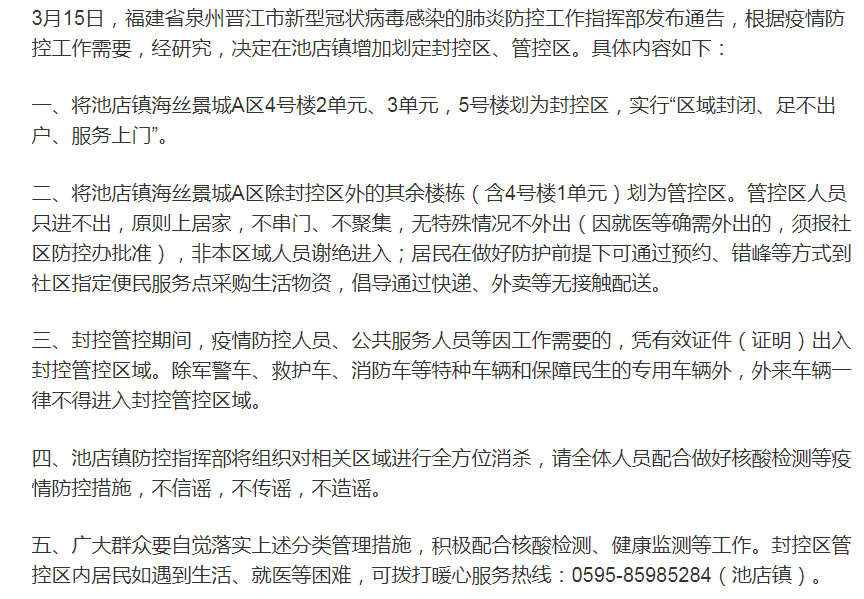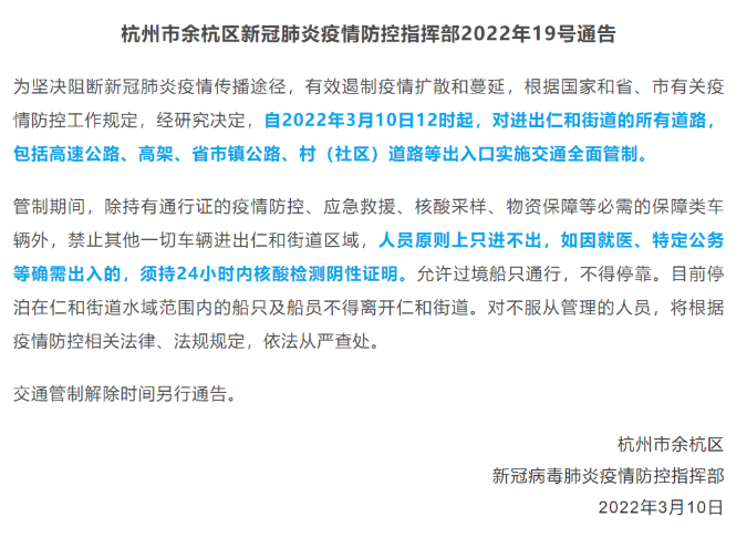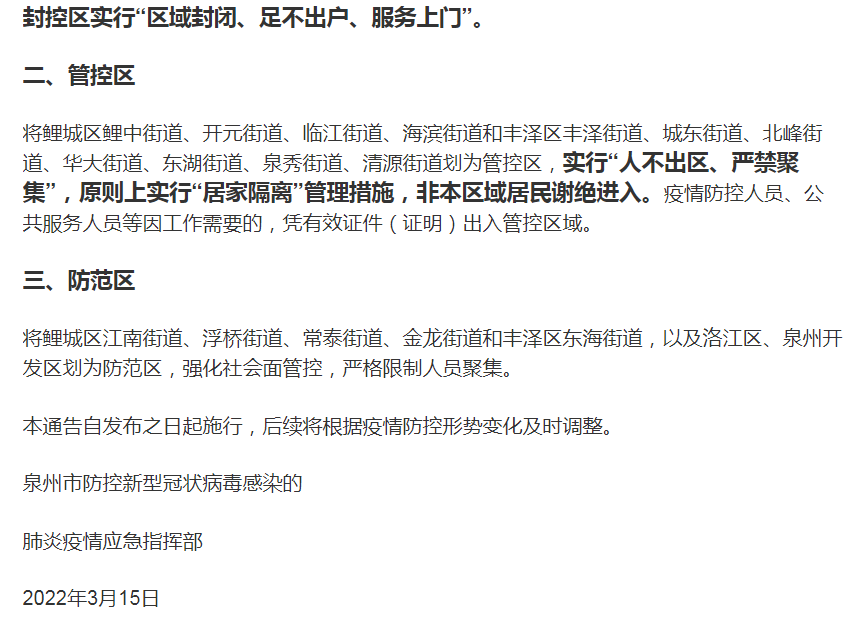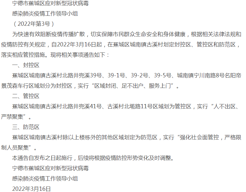 福田区全域实行交通临时管制,车辆“凭证通行”,非必要不上路。用于疫情防控、保障市民生活、城市基本运行和国计民生重点行业的保障车辆,凭单位出具的证明文件到社区党委或其指定地点申领“通行卡”进出社区小区卡口,允许在路面行驶,其余车辆一律停驶。非本区车辆,可从滨河大道、深南大道、北环大道通过性通行,其余道路和社区小区道路禁行。措施自3月15日至20日期间实行,后续将根据疫情防控形势动态调整。东莞:三个高速出入口实施临时交通管制因疫情防控需要,东莞市珠三角环线高速(莞深高速)、甬莞高速、从莞高速各有一个高速出入口将实施临时交通管制,管制期间,将禁止所有车辆通行。实施临时交通管制的高速出入口分别是:一、珠三角环线高速(莞深高速)大朗出入口二、甬莞高速东莞东站(常平镇)出入口三、从莞高速常平北出入口除保障城市运行及供港物资货运的交通外,全市公交地铁暂时停运。全市人员非必要不离莞,确有特殊需要,一律凭24小时核酸阴性证明离莞。以上防控措施从3月14日8时执行至3月20日24时。阳江市一、对以下路口实施封闭,请途经车辆注意绕行:1、新江东路漠江花园东门;2、新江东路湖景路路口;3、新江北路东汇城安信证券路口;4、新江东路骏程瓷砖路口;5、新江东路潮汕风味馆路口;6、新江东路金至尊后门路口。二、对东风三路以北、体育路以东、新江北路以南区域内路口实施封闭,只保留以下三个路口:1、体育路润之堂;2、体育路顶尖发廊路口;3、新江北路联创洗车路口。