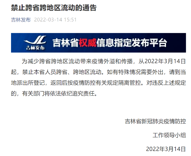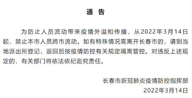 长春从2022年3月14日起,禁止本市人员跨市流动。