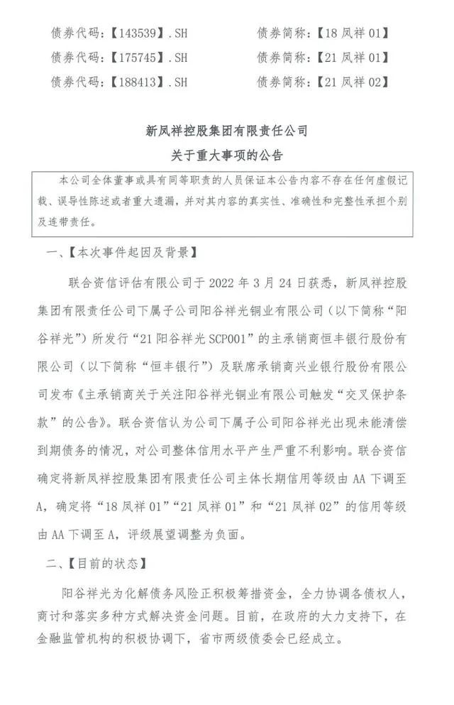 3月29日,新凤祥控股集团有限责任公司(以下简称“新凤祥集团”)公告称,子公司阳谷祥光铜业有限公司(以下简称“祥光铜业”)为化解债务风险正积极筹措资金,全力协调各债权人,商讨和落实多种方式解决资金问题。此前,祥光铜业由于存在7条未能清偿到期债务记录,触发“21阳谷祥光SCP001”交叉保护条款,构成交叉违约。