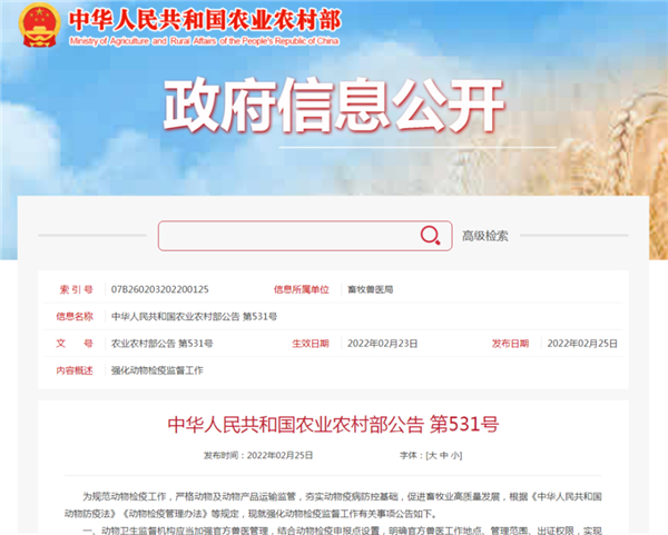 为规范动物检疫工作,严格动物及动物产品运输监管,夯实动物疫病防控基础,促进畜牧业高质量发展,2月25日,农业农村部发布《中华人民共和国农业农村部公告第531号》,并于2022年4月1日起执行。