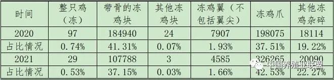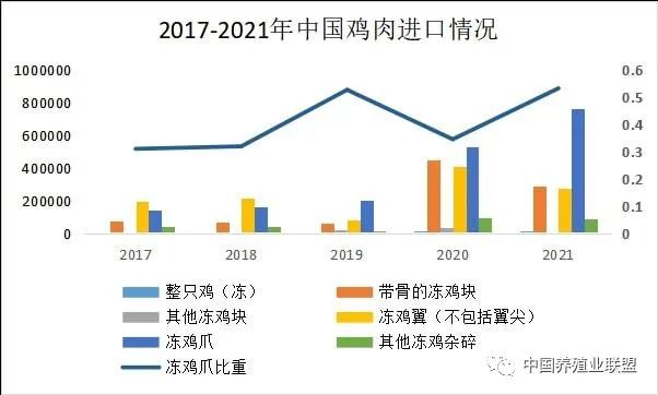 目前,中国从美国进口的禽类产品主要为冻鸡爪和带骨的冻鸡块。据海关总署数据,2021年,中国进口鸡类产品总量约144万吨。其中,冻鸡爪76.7万吨,占53%。