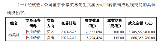 其中秦英林在2021年8月25日买入牧原转债3785万张,价格100元/张,2022年2月17日卖出579万张,价格115元/张,获利8688万元。