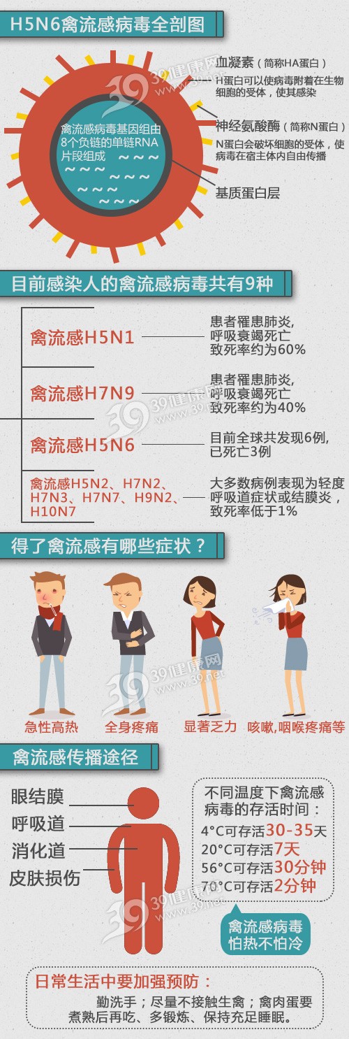 中国疾病预防控制中心病毒病所国家流感中心主任舒跃龙表示,H5N6几乎继承了H5N1禽流感病毒的所有特点,只是散发的偶发病例,目前研究表明,H5N6禽流感是由禽传给人的,患者的体液、分泌物等能够排出病毒,家人等之间无防护的密切接触也可能导致感染,但还没有证据发现H5N6病毒能在人和人之间大规模传播。