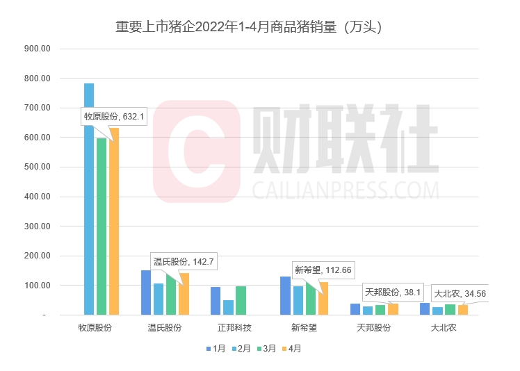 根据销售月报,牧原股份(002714.SZ)4月出栏量达632.1万头,再创历史新高并远超同行。温氏股份销售(300498.SZ)142.7万头、新希望(000876.SZ)112.66万头、傲农生物(603363.SH)38.52万头、天邦股份(002124.SZ)38.1万头、大北农(002385.SZ)34.56万头、唐人神(002567.SZ)16.55万头。