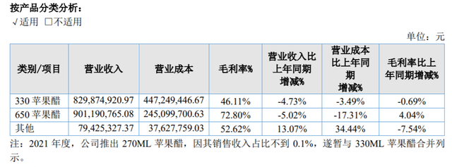 天地壹号2021年显示,期内实现营业收入18.17亿元,同比下滑4.33%;净利润为2.55亿元,同比增长1.64%,公司毛利率为59.67%。目前公司主要产品仍为苹果醋,2021年苹果醋销量占比超90%,其中330ml苹果醋收入8.3亿元,同比下滑了4.73%。650ml苹果醋收入9.01亿元,同比下滑5.02%。以及为了迎合现代社会低糖健康的消费理念,公司还开发并上市270ml的低糖健康易拉罐装陈醋饮料、低糖苹果醋饮料等产品。