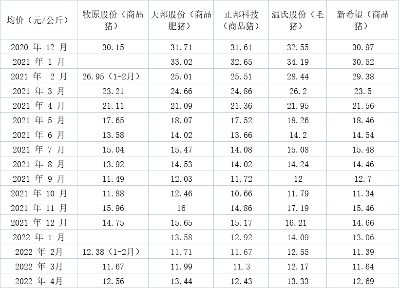 近日牧原股份(002714.SZ)、新希望(000876.SZ)、温氏股份(300498.SZ)、天邦股份(002124.SZ)、正邦科技五家上市猪企已全部发布4月的生猪销售情况简报。