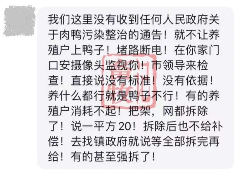 对此说法,有当地养殖户称这次治理异常严格,“堵路断电“,“安摄像头”,目的就是不让继续养肉鸭。