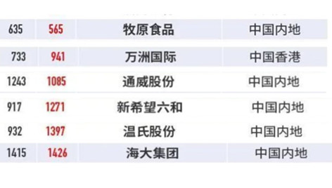 农牧企业有6家上榜,分别是牧原股份、万洲国际、通威股份、新希望六和、温氏股份和海大集团,他们位列榜单的第565位、941位、1085位、1271位、1397位和1426位。