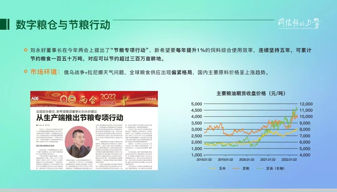 为保障粮食安全,践行双碳发展理念,新希望启动“节粮专项行动”,从生产端节约粮食使用。每年提升1%的饲料综合使用效率,即每年节约1%的粮食,连续坚持5年,就能累计节约粮食150万吨,对应节约耕地超300万亩。