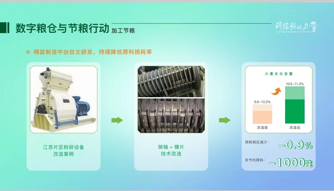 新希望在加工环节,通过自主研发,技术改造,对原有生产设备进行技术升级,致力于持续降低原料损耗。以江苏为例,当地玉米、小麦水分偏高,通用的粉碎设备如果粉碎过细,就会造成原料和能源的浪费。新希望对粉碎机配件进行技术改造,适应当地特点,使粮食损耗降低了0.7-1.1%,江苏片区一年就节约了一千吨原料。