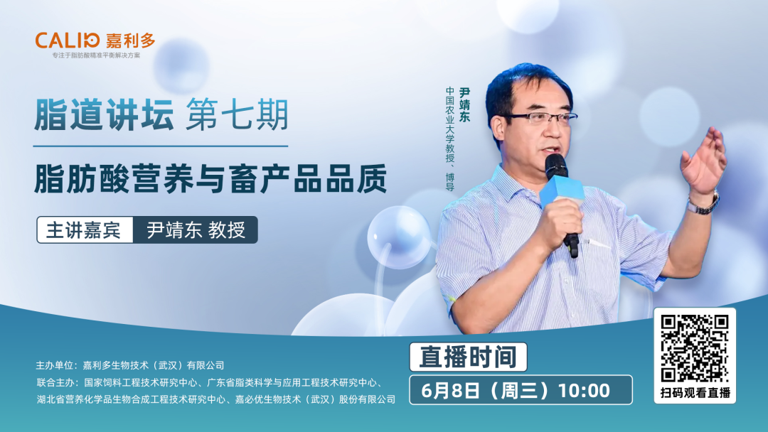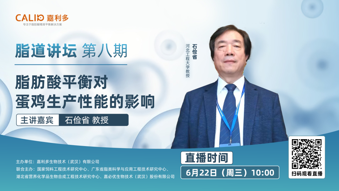 针对业界广泛关注的这些问题,我们特邀中国农业大学尹靖东教授、河北工程大学石俭省教授做客“脂类营养直播间”,分别于6月8日、6月22日来探讨“脂肪酸营养与畜产品品质”、“脂肪酸平衡对蛋鸡生产性能的影响”两大话题,敬请期待!