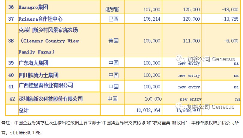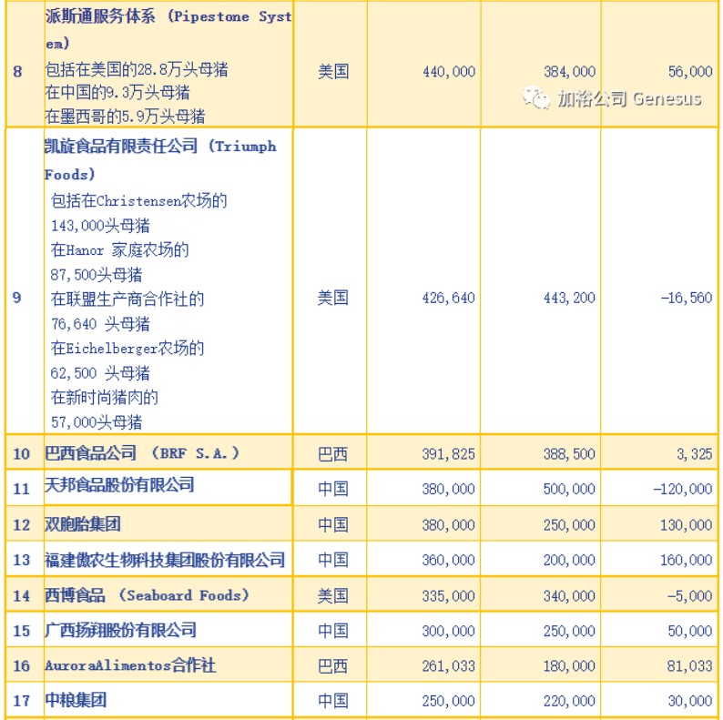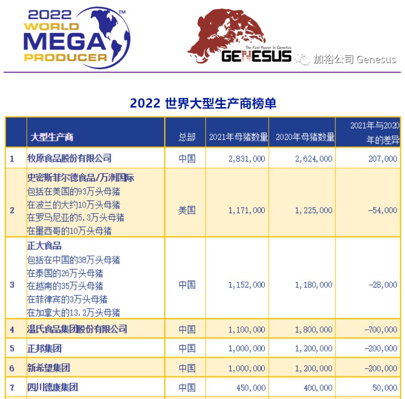 总的来说,加裕公布的2022年世界大型生产商榜单上超过10万头母猪的生产商与2021年相比变化不大。主要的区别是增加了四家拥有超过10万头母猪的新公司。