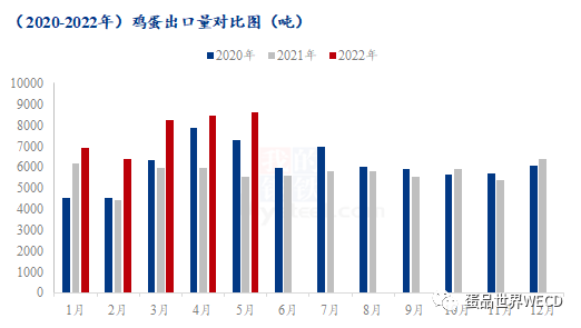 截至今年5月份,我国鲜鸡蛋出口量同比增幅明显,且从2月份开始,已经连续环比增长3个月,同时出口均价也高于往年同期,超出预期。