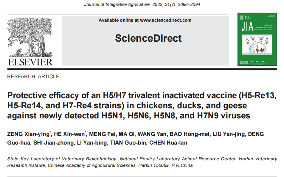 近期, 中国农业科学院哈尔滨兽医研究所陈化兰院士团队报告了2020年9月以来我国H5禽流感病毒的监测和研究成果以及疫苗免疫 对新入侵病毒的保护效果。相关研究在 Science China Life Sciences 、 Emerging Microbes &Infections 和 Journal of Integrative Agriculture 等杂志先后发表4篇文章。其中,题为“ Protective efficacy of an H5/H7 trivalent inactivated vaccine (H5-Re13,H5-Re14,and H7-Re4 strains) in chickens,ducks,and geese against newly detected H5N1,H5N6,H5N8,and H7N9 viruses”的研究论文以封面文章在 Journal of Integrative Agriculture (《农业科学学报》(英文),JIA) 2022年7期正式出版