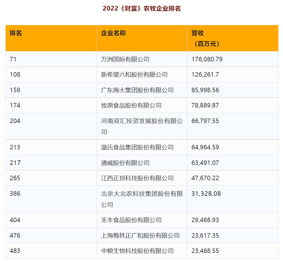 7月12日,财富发布了2022年的《财富》中国500强排行榜,考量了全球范围内最大的中国上市企业在过去一年的业绩和成就。小编根据其500强榜单,整理出今年在其上榜的农牧企业名单。
