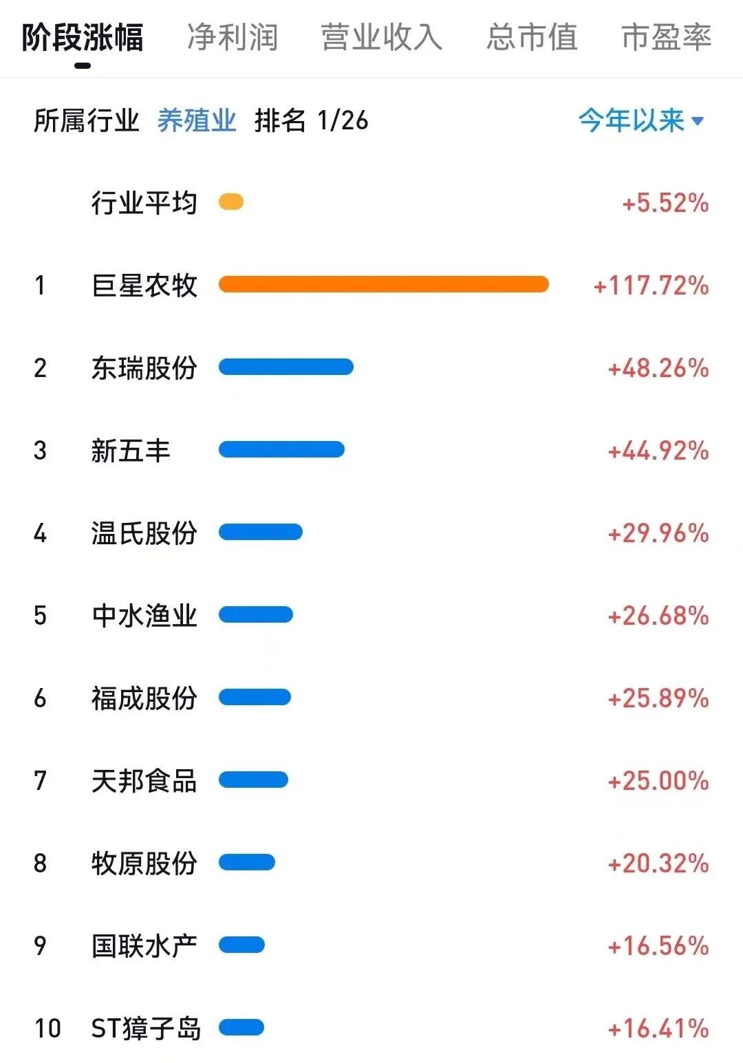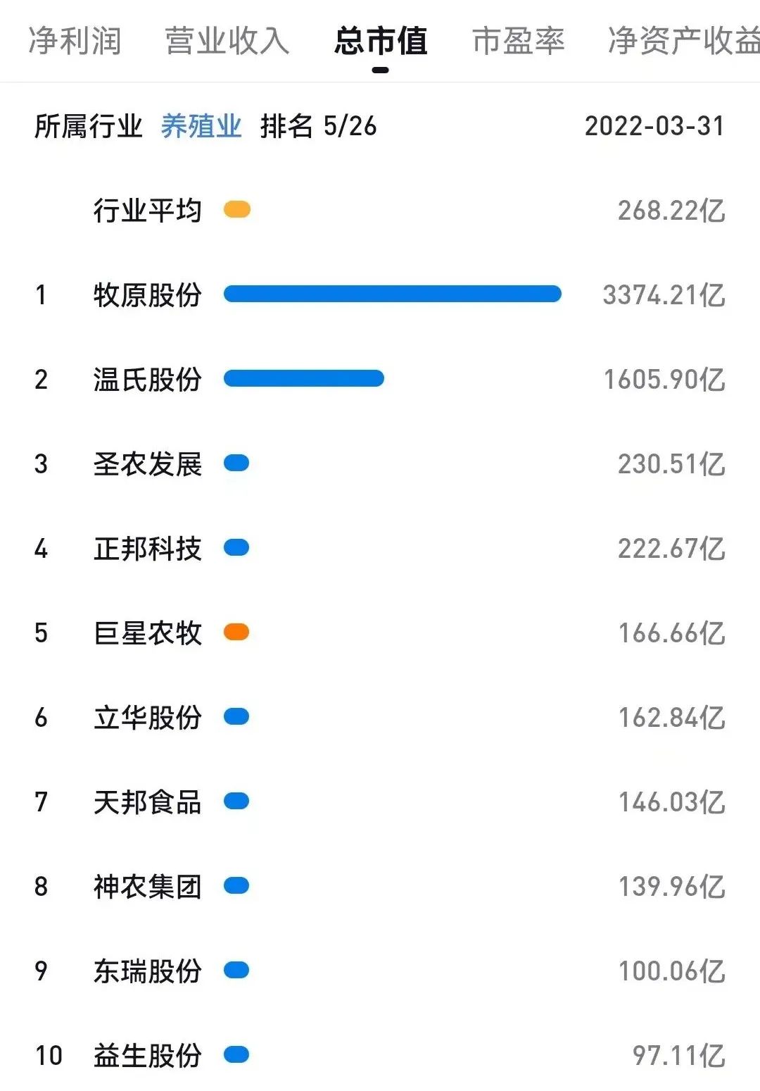 同时,小编也注意到,今年以来,巨星农牧股票阶段涨幅在养殖业中排名第一,而其总市值仅次于正邦,在猪企中排名第四,其中第一是牧原,第二是温氏,第三是正邦。