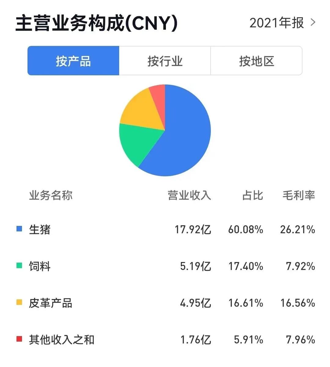 巨星农牧前身为振静股份,2020年7月完成资产重组后,主营业务由皮革产品转变为养殖业务,主销产品为生猪、饲料及皮革产品。目前生猪业务占比超60%,也是毛利率最高的业务板块。