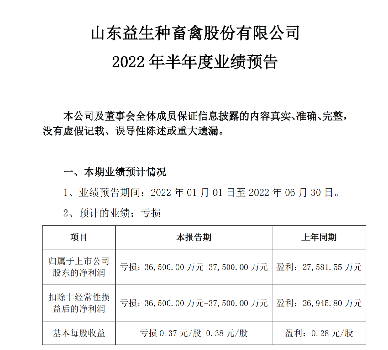 益生股份:预计2022年上半年净利润亏损3.65亿元~3.75亿元