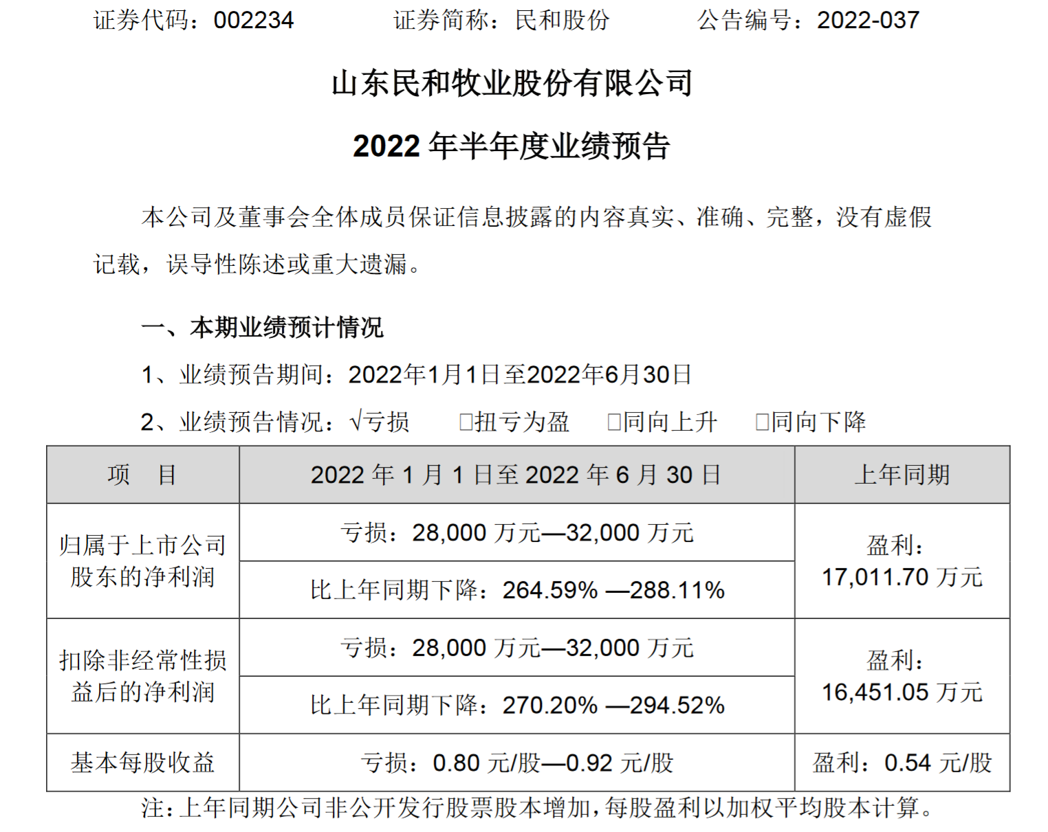 7月14日,民和股份近日发布2022年半年度业绩预告,预计2022年上半年实现归属于母公司所有者的净利润为亏损28,000万元—32,000万元,上年同期为17,011.70万元,同比由盈转亏,基本每股收益为亏损0.80元/股—0.92元/股。