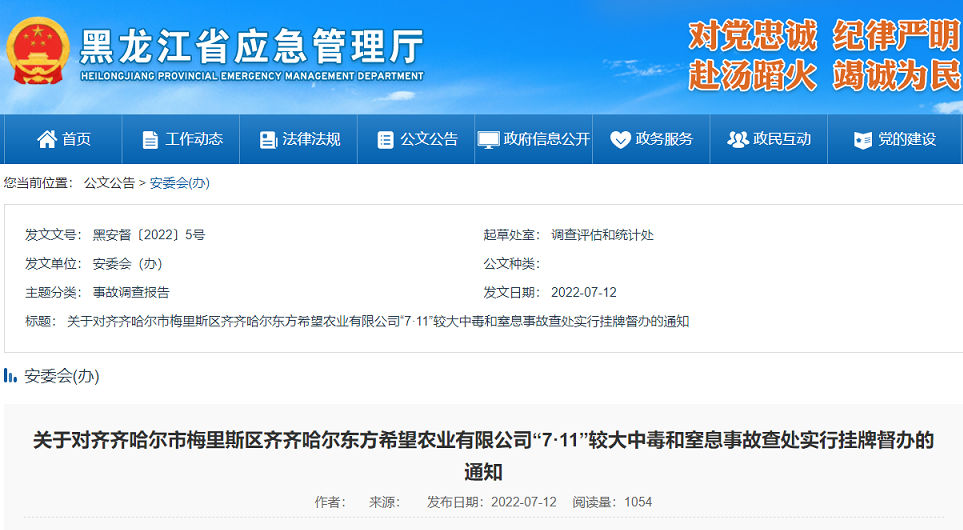 关于对齐齐哈尔市梅里斯区齐齐哈尔东方希望农业有限公司“7·11”较大中毒和窒息事故查处实行挂牌督办的通知