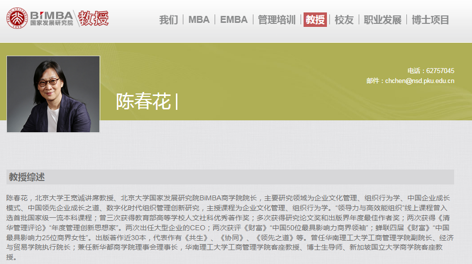 陈春花2016年入职北京大学国家发展研究院,曾担任北京大学国家发展研究院北大未来教育管理研究中心负责人、北大王宽诚讲席教授、北大国发院BiMBA商学院院长。