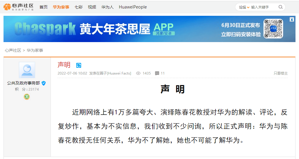 7月6日,华为“心声社区”发布的一则“声明”,将网红教授陈春花推到了舆论焦点上。声明称:“近期网络上有1万多篇夸大、演绎陈春花教授对华为的解读、评论,反复炒作,基本为不实信息,我们收到不少问询,所以正式声明:华为与陈春花教授无任何关系,华为不了解她,她也不可能了解华为。”