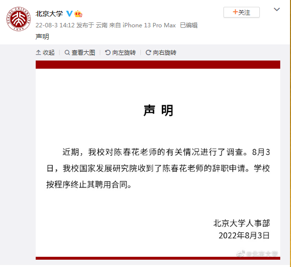 8月3日下午,北京大学发布声明,“近期,我校对陈春花老师的有关情况进行了调查。8月3日,我校国家发展研究院收到了陈春花老师的辞职申请。学校按程序终止其聘用合同。”