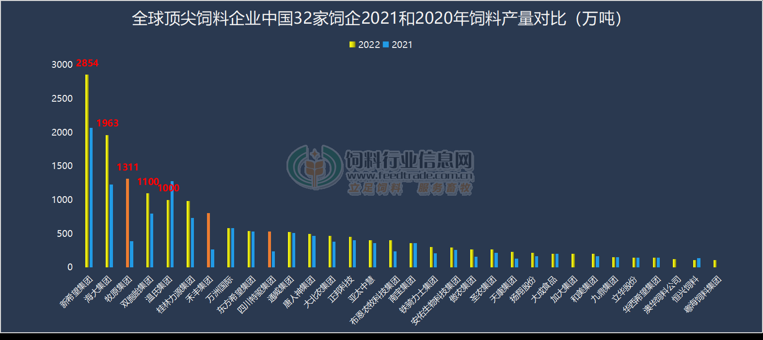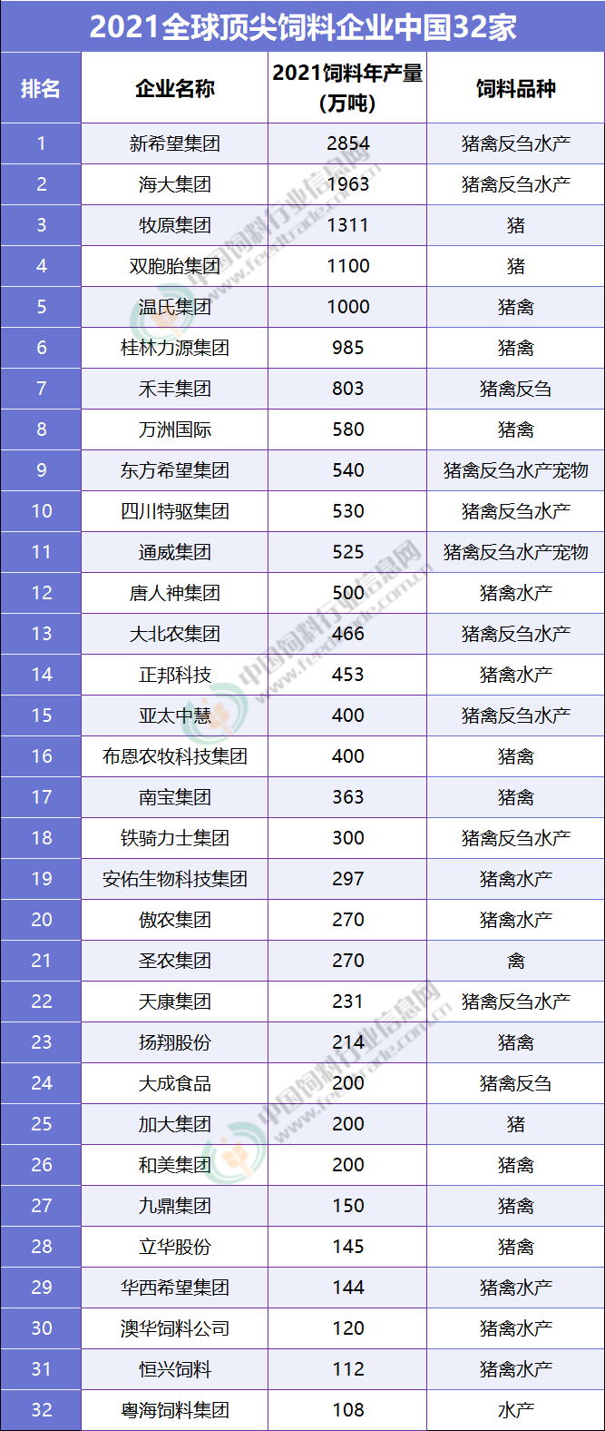 中国上榜的企业有32家,共生产饲料1.77亿吨,约占全国饲料总产量的60%,千万吨级的饲料企业有5家,共生产饲料8228万吨,占全国饲料总产量的28%。
