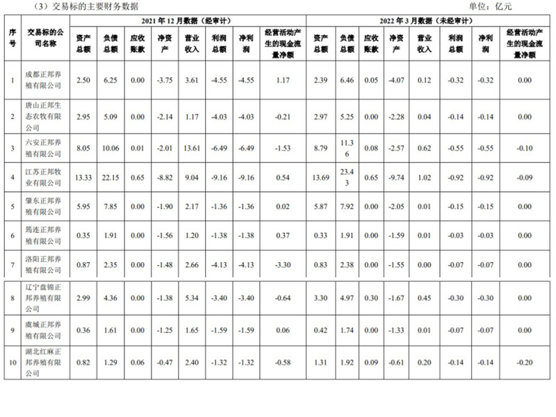 3、2022年7月1日,正邦科技发布公告,拟以每家公司股权转让价1元,总计10元向控股股东正邦集团转让10家全资子公司各49%股权。10家公司业务主要为生猪养殖,包括成都正邦、唐山正邦、六安正邦、江苏正邦、肇东正邦、筠连正邦、洛阳正邦、辽宁正邦、虞城正邦、红麻正邦。