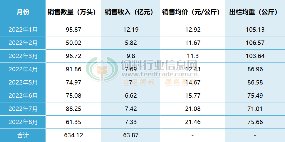 2022年1~8月,公司累计销售生猪634.12万头,同比下降39.37%;累计销售收入63.87亿元,同比下降73.27%。