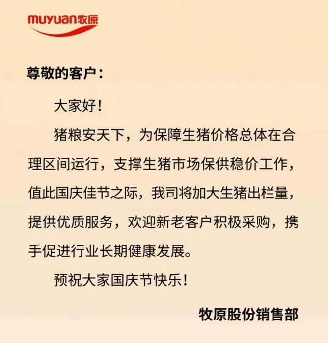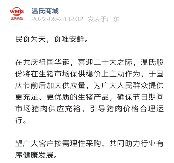 温氏商城公众号发布,民食为天,食唯安鲜,在共庆祖国华诞,喜迎二十大之际,温氏股份将在生猪市场保供稳价上主动作为,于国庆节前后加大供应量,为广大人民群众提供更充足、更优质的生猪产品,确保节日期间市场猪肉供应充裕,引导猪肉价格合理运行。