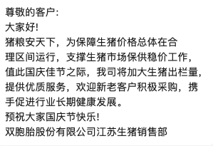 牧原股份、温氏股份、京基智农、双胞胎相关渠道分别发布在国庆节前加大生猪出栏量通知。牧原股份销售部公众号表示,为保障生猪价格总体在合理区间运行,支撑生猪市场保供稳价工作,将加大生猪出栏量。