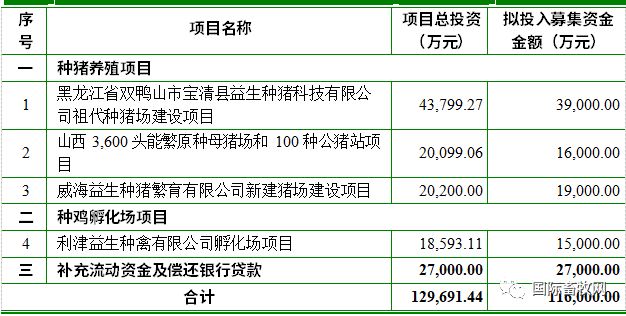 为满足生猪养殖企业规模化供种的需要,此次募集资金主要投向高代次种猪繁育项目。其中黑龙江省双鸭山市宝清县益生种猪科技有限公司祖代种猪场建设项目计划总投资额为 4.38亿元,项目全部达产后预计年实现销售收入4.55亿元,净利润9371.83万元。山西 3600头能繁原种母猪场和100种公猪站项目计划总投资额为2.01亿元,项目全部达产后预计年实现销售收入1.33亿元,净利润3331.13万。威海益生种猪繁育有限公司新建猪场建设项目计划总投资额为2.02亿元,项目全部达产后预计年实现销售收入1.33亿元,净利润3331.13万元。