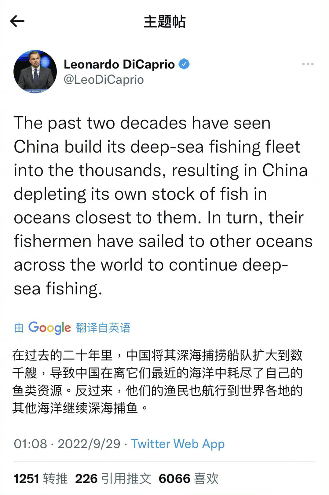 近日,被中国粉丝称为“小李子”的美国好莱坞影星莱昂纳多·迪卡普里奥在推特发文,称中国耗尽了本国沿海的渔业资源,远洋渔船还航行到世界其他海域继续深海捕捞,认为这种做法对当地经济以及海洋物种的可持续性影响敲响了警钟。其推文的内容,引用了美国《纽约时报》的两篇相关文章《中国如何瞄准全球鱼类供应》和《中国对鱼的巨大胃口》。