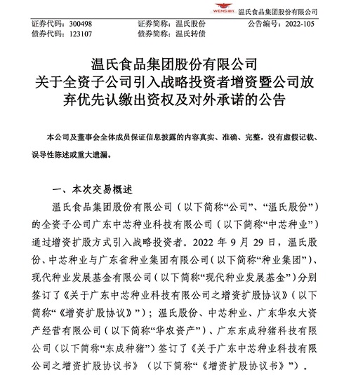 日前,温氏食品集团股份有限公司(以下简称“温氏股份”)发布公告称,其全资子公司——广东中芯种业科技有限公司(以下简称“中芯种业”)拟通过增资扩股方式引入引入国资战略投资,合计涉及投资额逾23亿元。