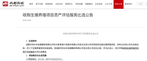 近期,成都国资亦联手新希望六和股份有限公司(以下简称“新希望”),共同投资实施生猪养殖项目。根据成都兴城投资集团(以下简称“成都兴城”)10月9日于官网发布的4则收购生猪比选公告,成都天府乡村发展集团有限公司(成都兴城投资集团有限公司全资子公司)拟与新希望成立合资公司,并拟以合资公司为实施主体,对四川省、重庆市或指定地点的21个生猪养殖项目实施收购。