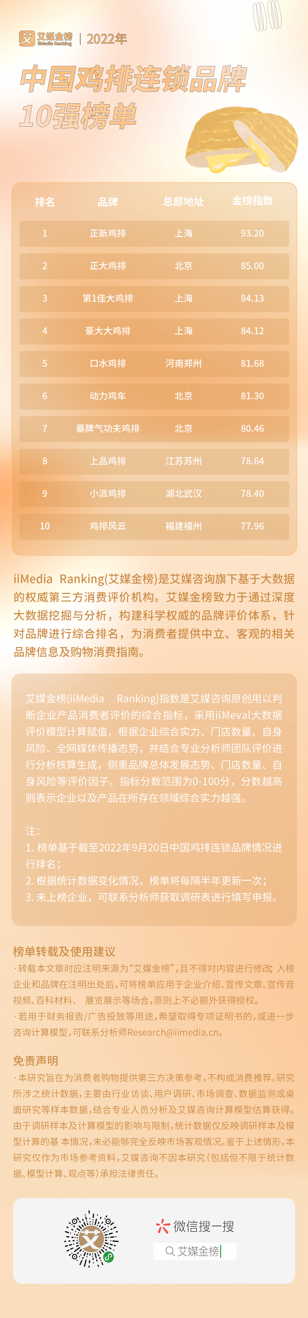 iiMedia Ranking(艾媒金榜)最新发布《2022年中国鸡排连锁品牌10强榜单》,以反映2022年中国鸡排连锁品牌的排名情况。