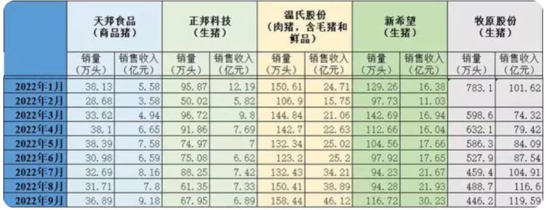 9月份,牧原股份生猪销售收入119.59亿元,环比增2.6%,同比增180.2%。温氏股份肉猪销售收入46.12亿元,环比增18.59%,同比增91.37%。新希望生猪销售收入为30.23亿元,环比增37.85%,同比增151.92%。天邦食品销售收入91830.29万元,环比增17.78%,同比增97.8%。正邦科技销售收入6.89亿元,环比下降6.01%,同比下降60.42%。
