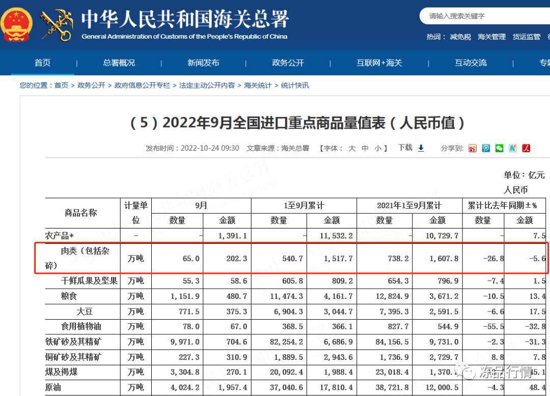 10月24日,中国海关总署统计分析司发布9月进出口肉类产品统计信息,数据显示,9月我国进口肉类(含杂碎)共计65万吨,环比下跌1万吨,同比下跌6.2%。进口额202.3亿元人民币,同比增长19.3%。