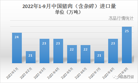 其中猪肉(含杂碎)进口量为25万吨,较8月进口量增加了2万吨,比去年当月同期减少了约20%,累计1-9月进口量204万吨。