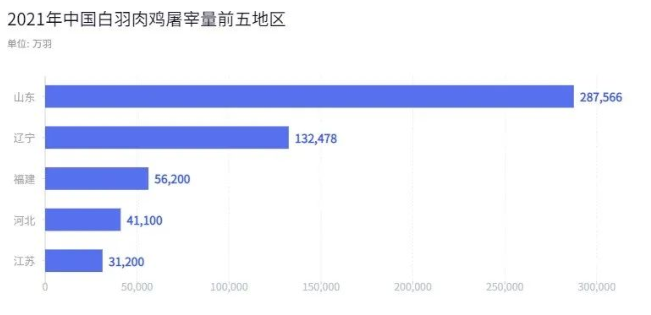 数据显示,2021年我国累计屠宰白羽肉鸡67.7亿羽,山东、辽宁、福建、河北、江苏为全国白鸡屠宰量Top5,五省屠宰量合计54.85亿只,占全国81%。